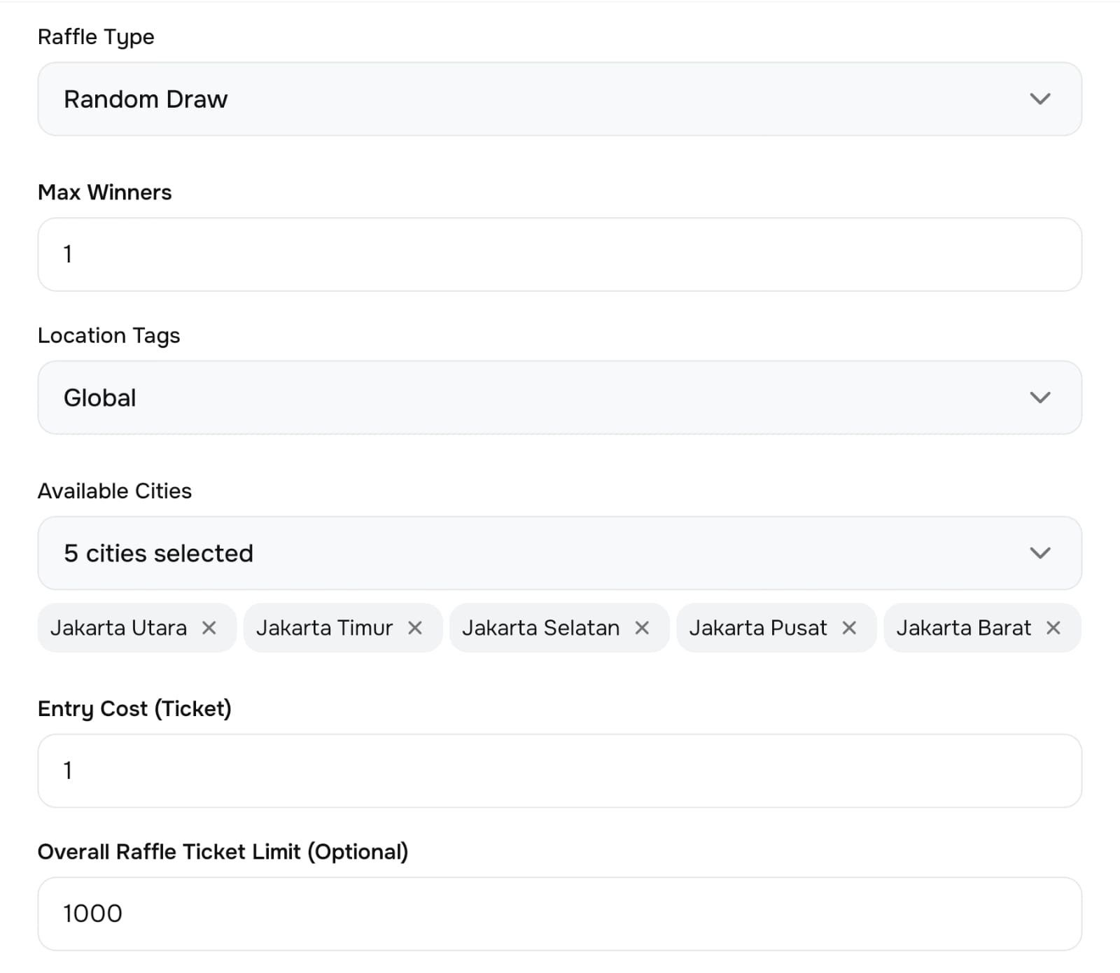 The Available Cities section allows you to limit the raffle to specific cities.