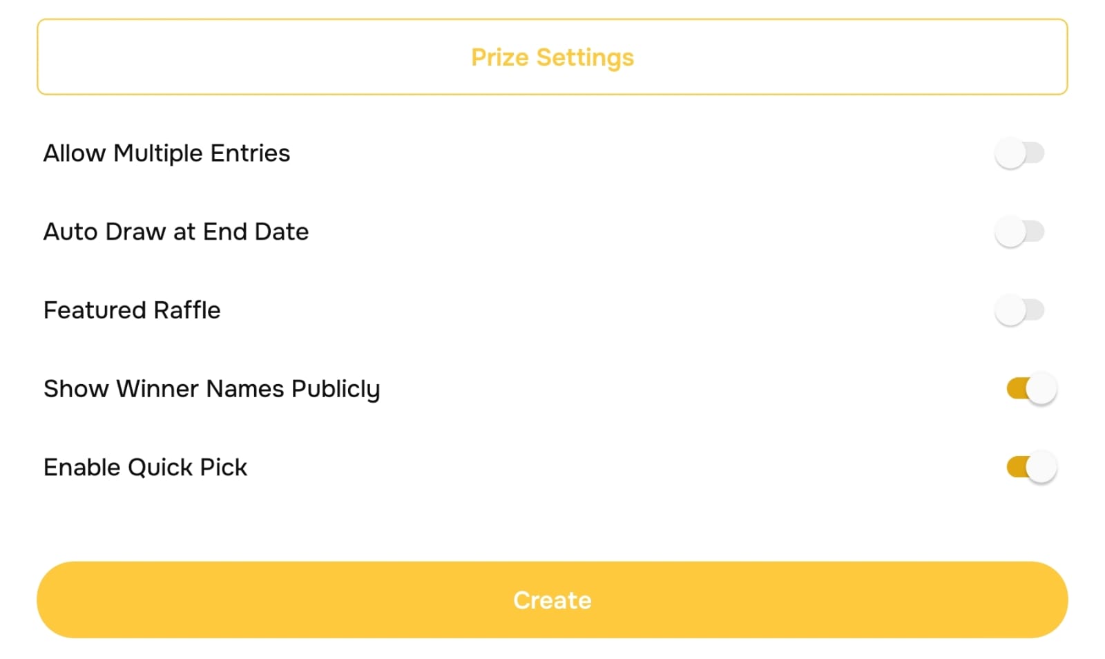 Enable the necessary settings according to your raffle requirements, then click the Create button.