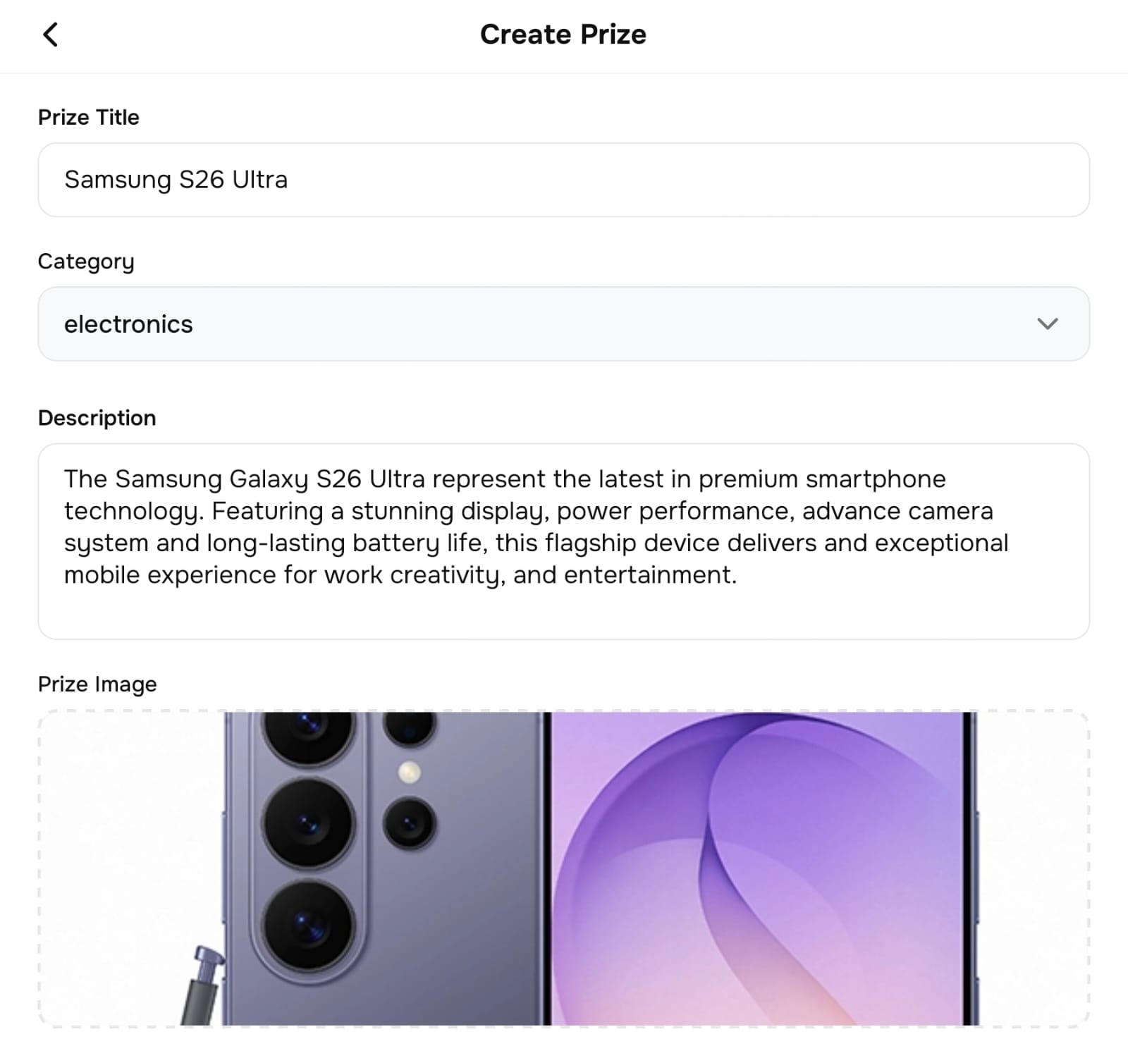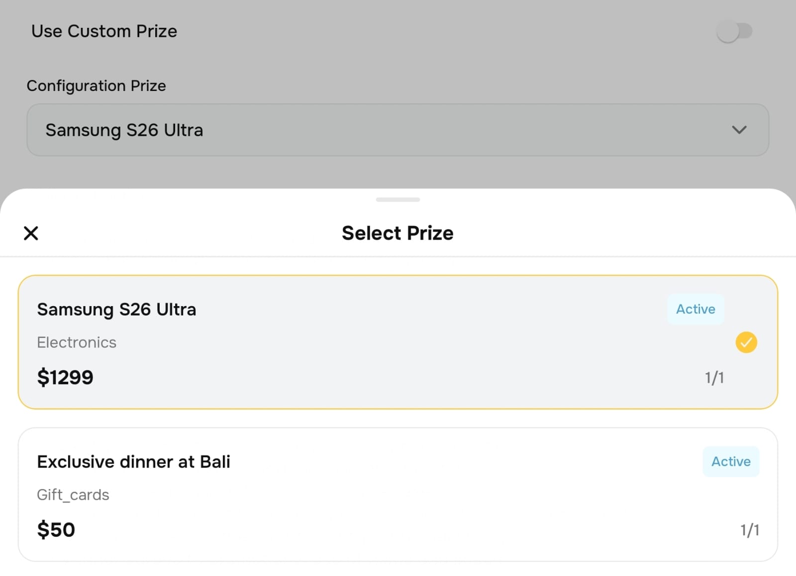 Once created, the prize will be available in the Configuration Prize dropdown when creating a raffle.