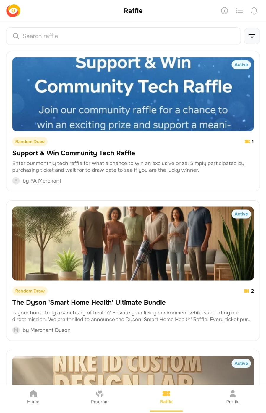 Through merchant raffles, merchants can launch campaigns that allow users to participate using raffle tickets obtained through donations.